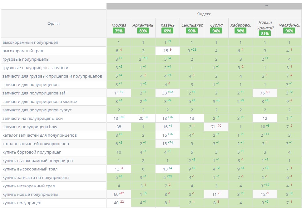 Иногда приходилось проводить анализ запросов ежемесячно, т.к. некоторые запросы имели высокую динамику позиций в течение внедрений рекомендаций. Например, сегодня «полуприцеп тяжеловоз» был на 3 месте, а через неделю он мог быть уже вне ТОП-10. Так происходит, когда изменений по странице много, так как каждую неделю мы вносили небольшие корректировки.